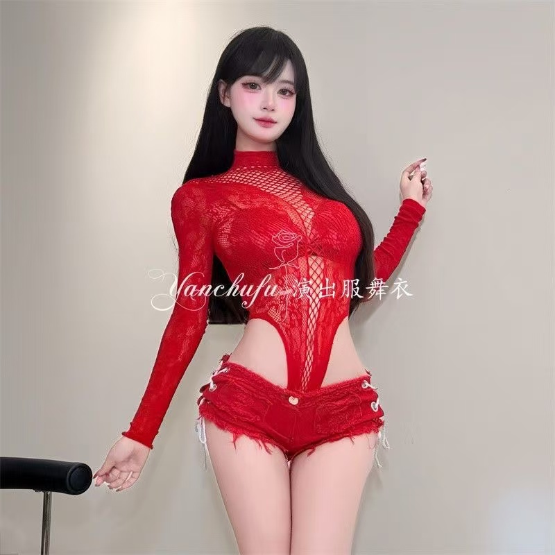 / Seductive Red Fishnet Dancewear Set